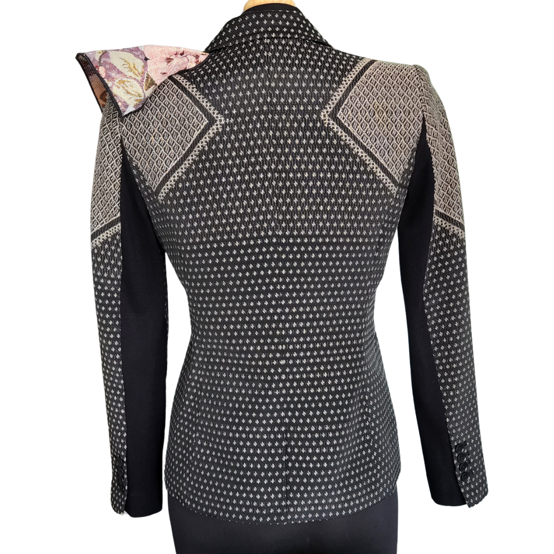 This upcycled blazer is defined by a sculptural ruffle detail placed at the front—an unexpected statement that transforms classic tailoring into wearable art. Each piece is crafted from carefully sourced garments and elevated with thoughtfully selected textiles, giving every blazer its own rhythm, texture, and personality.